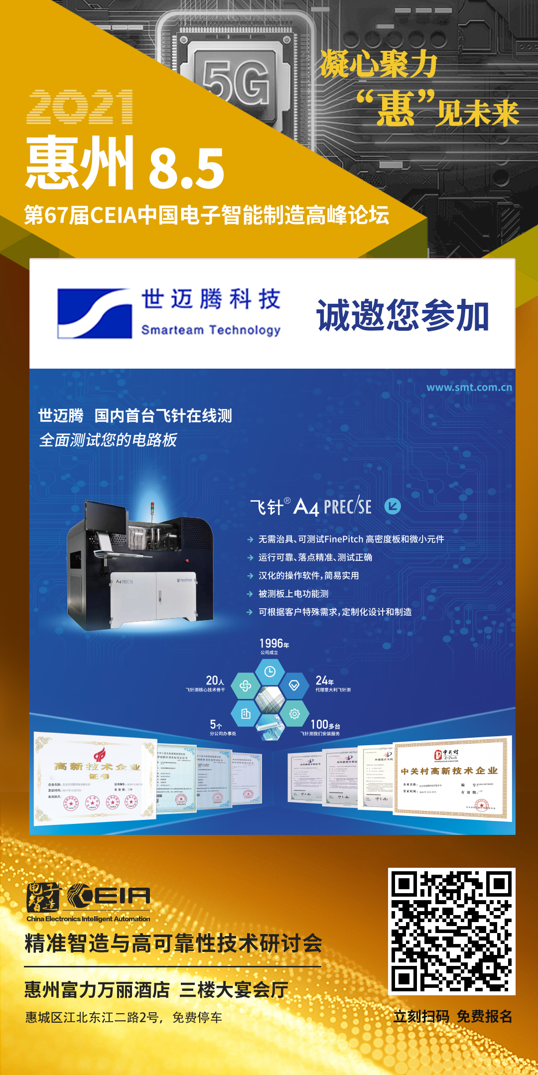 世迈腾诚邀您参加第67届CEIA中国电子智能制造高峰论坛会议 发布时间:2021-08-02 世迈腾科技诚邀您参加第六十七届CEIA中国电子智能制造高峰论坛会议!时间:2021年8月5日地址:惠州富力万丽酒店 三楼大宴会厅 上一个 下一个