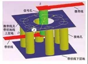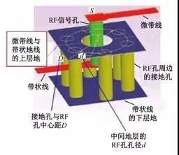 3D微波LTCC多层互连基板技术采用3D电磁场仿真软件HFSS连接微带线与带状线的RF孔穿过中间层地时,中间地层需开孔,其直径为d。在RF孔周围设置接地孔,连接中间层微带地线(即带状线上层地)与带状线下层地,可有效抑制辐射损耗,接地孔与RF孔中心距为D。传输线与RF孔相连处是宽度为S的正方形盘,比传输线宽度略宽,以补偿RF通孔带来的电感效应,如图9所示。