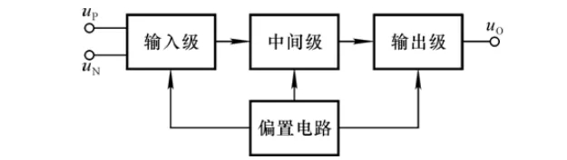 输入级:常为差分放大电路,要求Ri大Ad大Ac小, 输入端耐压高,它有同相和反相两个输入端。中间级:主放大级常为共射放大电路,多采用复合管,要求有足够的放大能力。输出级:功率级,多采用互补功放电路或射极输出器,要求Ro小,最大不失真,输出电压尽可能大。- 反馈网络: 必须是正反馈,反馈信号即是放大电路的输入信号